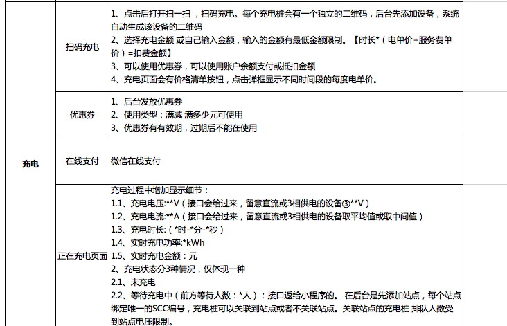 地图寻找网点,在线扫码充电,充电下单支付,充电状态,充电提醒,充电数据,优惠券,发票申请