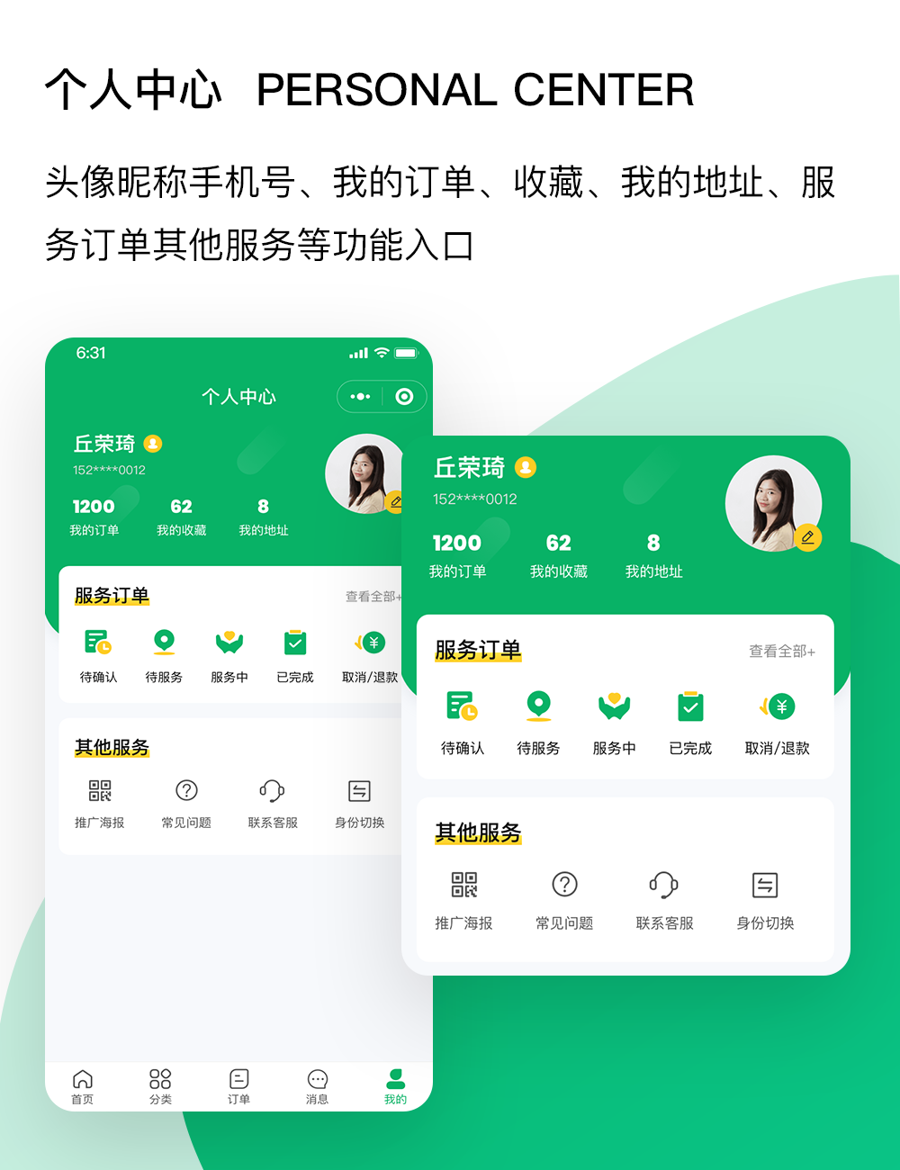 技师展示:头像,昵称,工作状态,星级,接单数量,服务好评,服务项目,所属门店,技师介绍,排班时间,服务详情